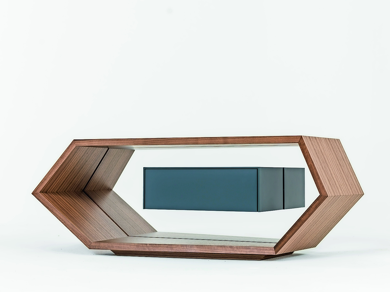 Der Grundgedanke beim Meisterstück von Dominik Fastl von der HTBLVA Graz - Ortweinschule war, ein Möbelstück zu entwerfen, das für den alltäglichen Gebrauch nützlich ist. Nach reichlicher Überlegung fiel seine Wahl auf einen Wohnzimmertisch, der einerseits einen kleinen Stauraum für Zeitschriften und Fernbedienungen bietet, aber auch als Ablage für Alltagsgegenstände dienen sollte. So erhielt er eine trapezförmige Grundform, deren Teile sich bandartig um einen scheinbar schwebenden Ladenkorpus schließen. Damit dieser schwebende Eindruck entsteht, wurde in der Mitte des umschließenden Teiles eine Acrylglasplatte eingesetzt.