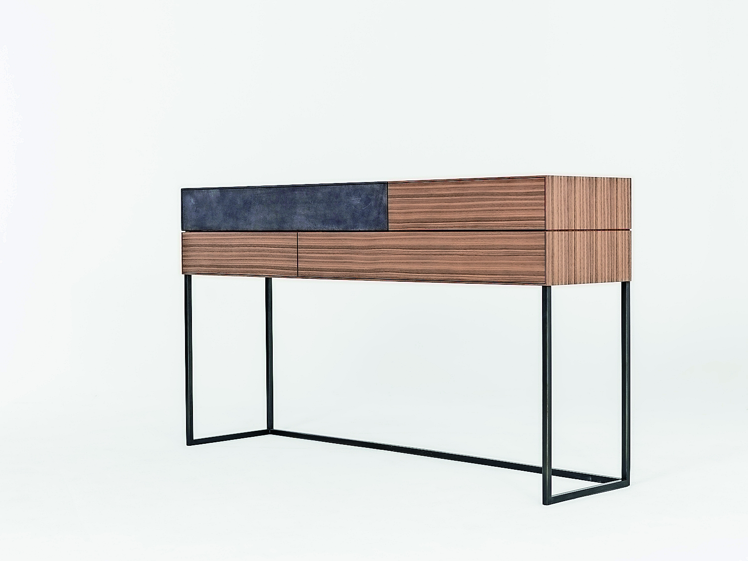 Dies wird durch ein Zusammenspiel von Holz, Leder und Metall geschafft. Das Meisterstück besteht aus einem Korpus, das von einem Gestell getragen wird. Gemeinsam montiert, betragen die äußeren Abmessungen 1.600 mm in der Länge, 900 mm in der Höhe und 400 mm in der Tiefe. Das Gestell besteht aus 20 x 20 mm großen Quadrat-Formrohren, gefertigt aus Schwarzstahl. Diese werden als zwei U-Formen, die mit einer Querstrebe hinten am Boden zusammengehalten werden, geschweißt. Die Verbindung zum Korpus wird durch am Gestell angeschweißte Stifte, die in den Seiten eingelassen werden, gewährleistet. Der Korpus und drei Fronten werden aus Spannplatten, die mit amerikanischer Nuss furniert werden, gefertigt. Für den Kantenschutz werden Anleimer aus amerikanischer Nuss benützt. Der obere linke Teil des Korpus besteht aus einer Spannplatte als Grundplatte, die mit einem lederbezogenen Aluwinkel aufgedoppelt wird. Die obere linke Ladenfront wird ebenfalls mit Leder bespannt. Der gesamte Korpus wird auf der Vorderseite mit einem Falz versehen. Zur Stabilisation wird der gesamte obere Teil mittels Einhängeleiste an der Wand befestigt. Alle Laden sind aus Massivholz gefertigt und mit Zinken verbunden. Der gesamte Holzbestand des Möbels wird im Glanzgrad G5 lackiert. Das Stahlgestell wird gewachst.