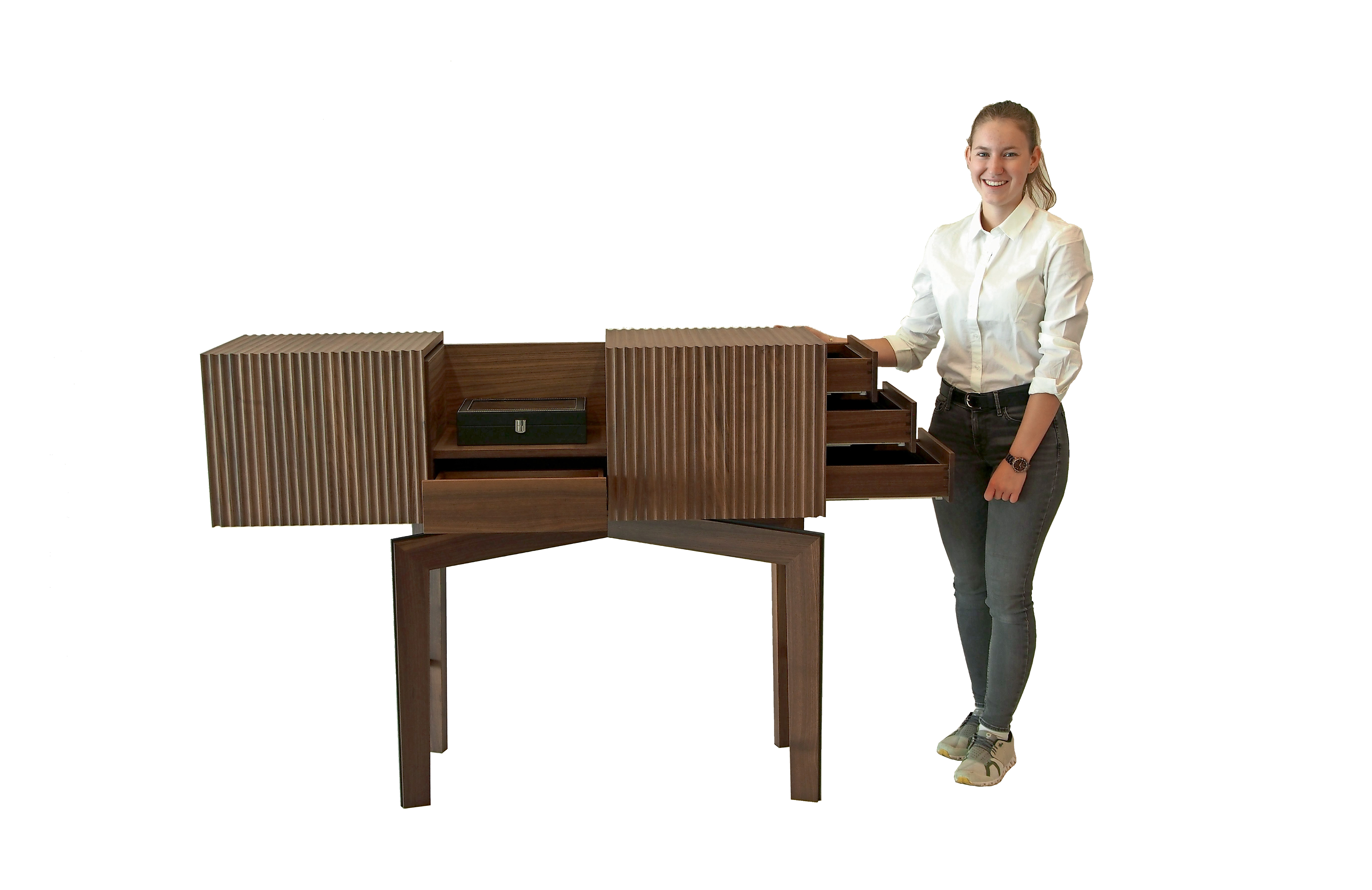 Mit dem Grundgedanken ein zeitlos schönes Möbel für die Aufbewahrung von Uhren und Schmuck zu erstellen, machte sich Florentine Mandorfer von der HTBLA Hallstatt an die Erstellung einer Kommode als Meisterstück. Das Objekt besteht aus Nuss-Dreischichtplatten und einem ebenfalls in Nussholz gefertigten Fußgestell mit eingenutetem acht Millimeter starkem Schwarzstahl. Aufgrund der kompakten Form sowie der gediegenen Maserungen des Nussholzes verfügt das Objekt über einen skulpturalen Charakter bei einem gleichsam eleganten Antlitz.