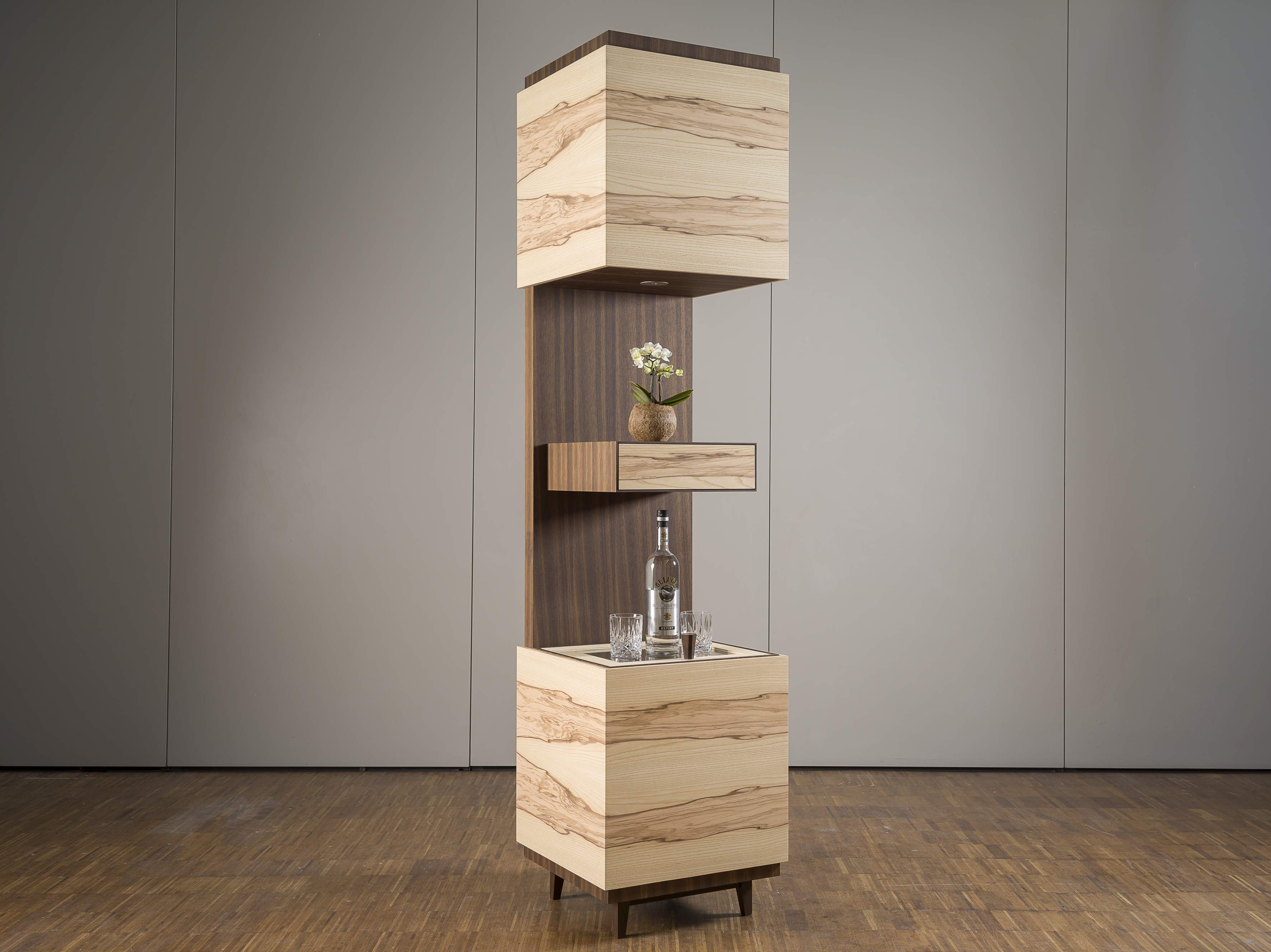 Maximilian Ebert hat am Wifi Innsbruck ein hochformatiges Möbel mit wandelbarem Antlitz geschaffen: Die „vertikale“ Schnapsbar lässt sich über zwei Schiebelemente öffnen und schließen und wirkt so abwechselnd mehr wie eine Vitrine oder wie ein komplett geschlossener Quader.