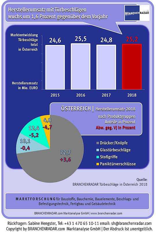 Angeschoben von einer wachsenden Nachfrage nach Türen, entwickelte sich im Jahr 2018 auch der Markt für Türbeschläge positiv. Die Herstellererlöse erhöhten sich um 1,6 Prozent gegenüber dem Vorjahr auf 25,2 Millionen Euro. Die Wachstumsbeiträge kamen jedoch ausschließlich von Drückern und Knöpfen aus Edelstahl. Hier lag das Umsatzplus sogar bei knapp sieben Prozent gegenüber dem Vorjahr. Drücker und Knöpfe aus Aluminium entwickelten sich erlösseitig indessen einmal mehr rückläufig (-2,0 Prozent gegenüber dem Vorjahr), genauso wie Stoßgriffe und Paniktürverschlüsse mit jeweils rund minus fünf Prozent gegenüber dem Vorjahr. Der Umsatz mit Glastürbeschlägen betrug stabile 2,6 Millionen Euro. Hinsichtlich der Türtypen zeigten Haus- und Wohnungstüren, sowie Feuerschutztüren die stärkste Dynamik.