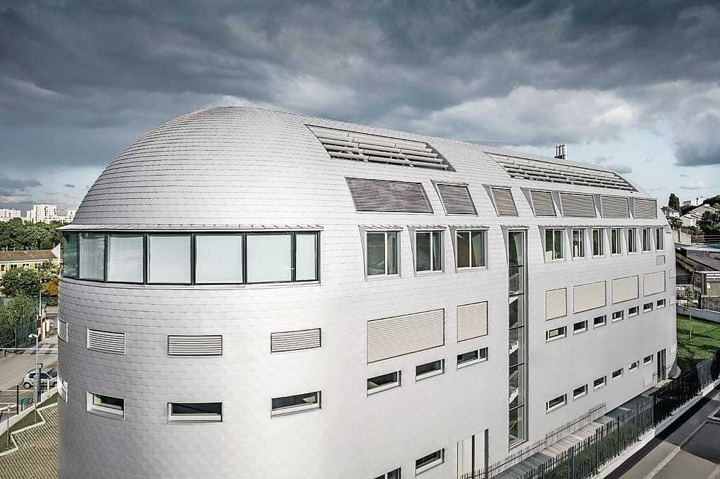 „Eine Festung zu entwickeln, die hochtechnologischen Inhalt gut behütet, war der Grundgedanke bei dem Entwurf“, erzählt sie. Entstanden ist ein futuristisch angehauchtes Gebäude mit abgerundeten Ecken. Die komplette Außenhaut ist mit insgesamt 20.000 Aluminiumschindeln überzogen. Blazkowski wollte Tradition und Moderne in Einklang bringen. „Die Tradition findet sich hier in der Fassade wieder, eine Schindelfassade in Form eines Domes, welche traditionell in Paris bei Gebäuden des 19. Jahrhunderts genutzt wurde. Bei unserem Bau ging es um die Neuinterpretation der Gestalt, weg von der eckigen Kiste, hin zu einer zeitgenössischen Formensprache.“
