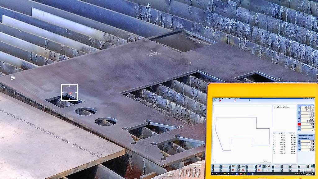 Das Softwaremodul „Geometrie- und Konturerfassung“ erfasst mithilfe eines Laserpointers den nutzbaren Bereich eines bereits zugeschnittenen Blechs oder eines Rohblechs und erstellt eine DXF-Datei. Zur Erfassung der Geometrie fährt die bedienende Person je nach verwinkelter Kontur beliebig viele Punkte – mindestens aber vier Punkte – mit dem Laserpointer an, um so die Blechgeometrie der Resttafeln möglichst genau zu definieren. Die Software verbindet die Punkte zu einer Kontur im DXF-Format. Innerhalb dieser Kontur können dann mit entsprechender CAM-Software die nächsten Schneidaufträge verschachtelt werden.