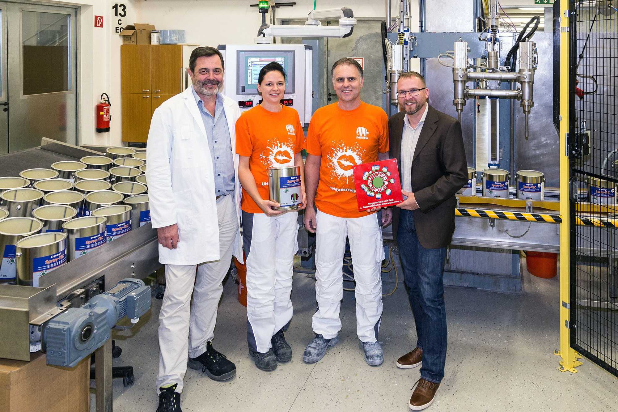 Capacryl Spray-TEC von Synthesa darf staatliches Öko-Label führen und wird in Perg CO2-neutral produziert. Produktionsleiter Johann Wakolbinger, Kornelia Unterauer, Alfred Kaiselgruber und Produktmanager Markus Smeykal.