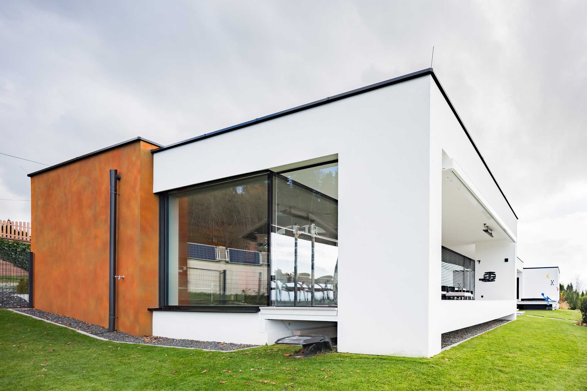 Der Bungalow des Technikers ist ein Designerhaus mit besonderem Grundriss. Der hintere Teil wurde vom Wernberger Handwerksbetrieb Gruber Estriche, der auch die Dämmung, die Fassade und die Innenwandgestaltung vornahm, in authentisch anmutender Rostoptik ausgeführt.