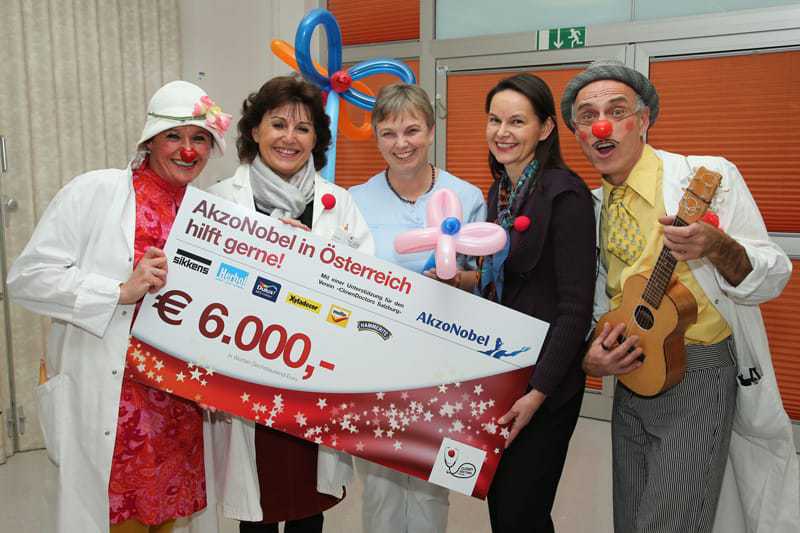 Die „ClownDoctors Salzburg“ sind seit 1994 in den größten Salzburger Spitälern tätig und heitern mit viel Spaß sowie bunter Unterhaltung Kinder und Jugendliche während ihres Krankenhausaufenthalts auf. Speziell ausgebildete Clowns sorgen mit der anerkannten „Humortherapie“ für heitere Stunden und beschleunigen dadurch oft den Heilungsprozess. 2014 ist für die ClownDoctors auch ein Premierenjahr. Ab Anfang nächsten Jahres besuchen sie erstmals auch Erwachsene auf der Bettenstation der Radio Onkologie im LKH Salzburg. Somit betreuen sie zusätzlich zu den über 5.300 kranken Kindern und Jugendlichen auch erwachsene Langzeitpatienten. Jeweils zwei ClownDoctors werden alle 14 Tage die Station besuchen und mit der Humortherapie etwas Lachen, Zuversicht und auch Farbe in den Klinikalltag bringen. „Diese Aufgabe ist nur mit Hilfe von Spenden zu bewältigen und deshalb sind wir besonders dankbar, dass AkzoNobel dieses Projekt für ein Jahr unterstützen wird“, zeigt sich Claudia Pallasser, Geschäftsführerin der ClownDoctors Salzburg, sehr glücklich.