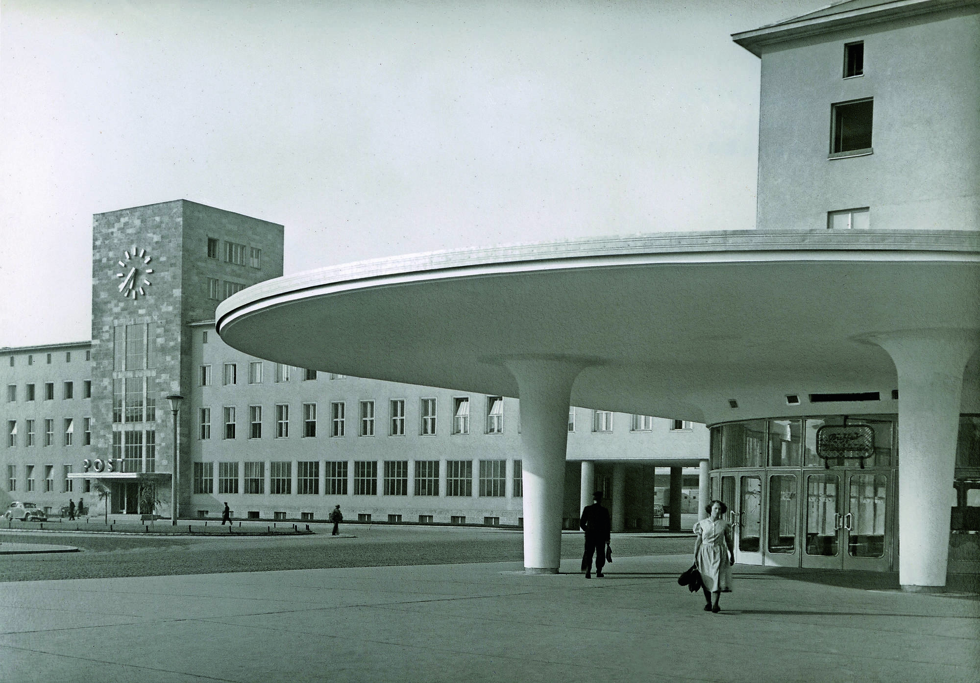 Das Postgebäude schließt das Bahnhofsgelände riegelartig nach Südwesten ab. Das auskragende Dach der Postbusabfahrt greift mit seiner dynamische Formensprache in den Verkehrsraum der vorbeiführenden, viel befahrenen Kärntnerstraße ein und „thematisiert“ mit seinem halbrund geführten Abschluss nach Norden in für die 1950er Jahre typischen Formen Aspekte wie Bewegung und Verkehrsfluss.