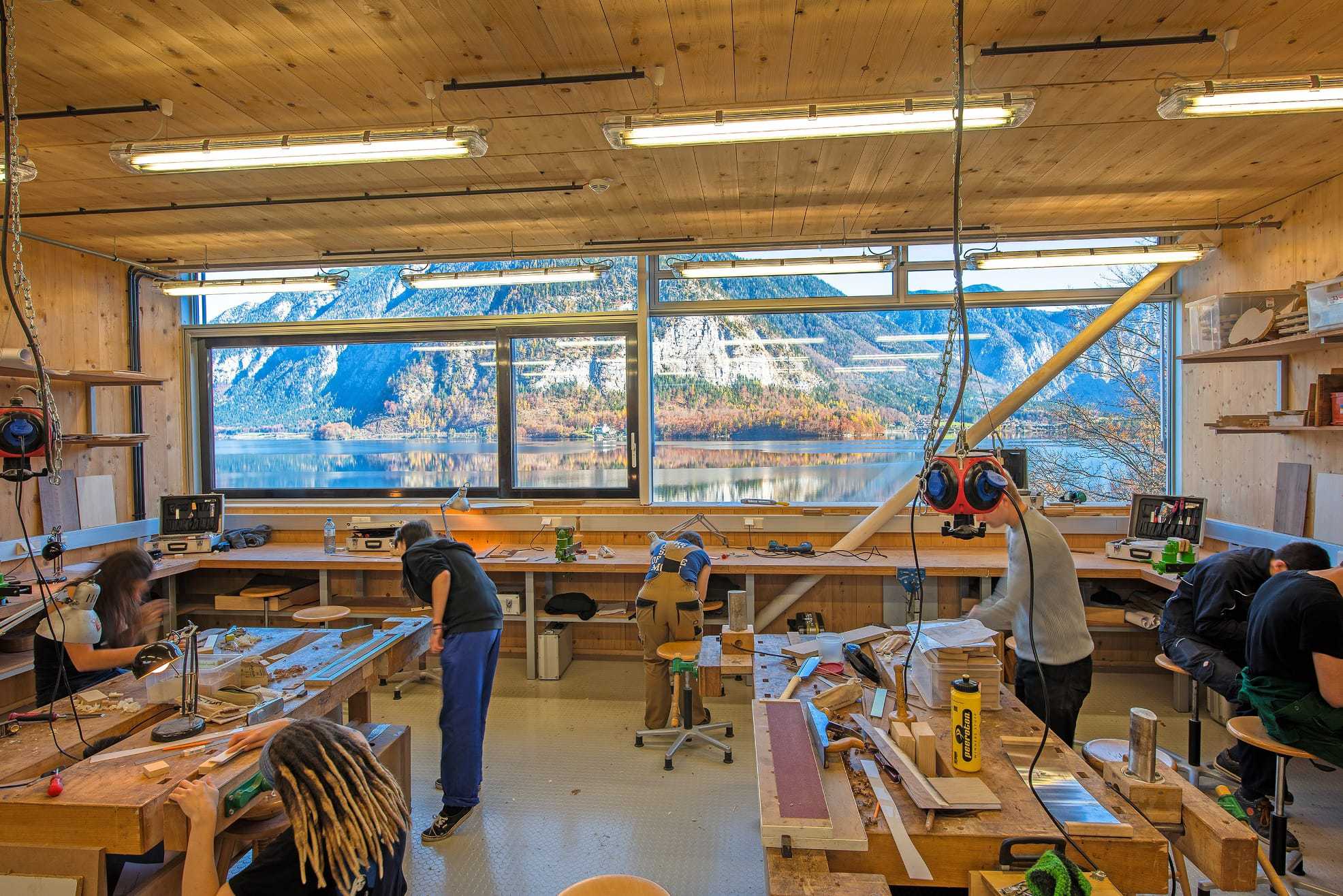 "Wir haben rund 12,2 Millionen Euro in das Projekt investiert", sagt BIG Geschäftsführer Wolfgang Gleissner. Rund drei Jahre sanierte und erweiterte die BIG die Schule am Hallstätter See. Zu Baubeginn stand das Werkstättenareal im Fokus. Neue Fassaden, Fenster und Dächer senken den Energieverbrauch der bestehenden Werkstätten für Bildhauer und Tischler. Eine neue Lüftungsanlage inklusive Wärmerückgewinnung sorgt für eine bessere Absaugung von Holzstaub und –spänen. Ein Flugdach verbindet die beiden Gebäude und bietet Schutz vor der Witterung. Die Bildhauer-Werkstatt wurde um ein Holzlager erweitert. Die Tischlerei „wuchs“ um einen dreigeschoßigen Zubau mit Klassenzimmern und Räumen für den Instrumentenbau. Er ist nah am Wasser gebaut und bietet Seeblick.