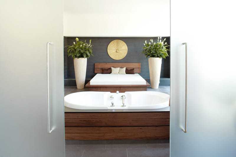 Ebenso wesentlich wie mehr Platz: gutes Licht. Dazu Adelheid de Durand: „Helligkeit und Beleuchtung sind uns sehr wichtig, dazu haben wir ein durchdachtes Lichtkonzept geschaffen.“ Gearbeitet wird mit Hinterleuchtungen und Direktbestrahlung der Spiegel. Rund ein Drittel der Zimmer – die Weingartensuiten im Zubau – verfügen über Tageslicht im Bad und sind mit freistehenden, in den Wohnraum integrierten Badewannen ausgestattet. Die Rundumverglasung bietet einen schönen Ausblick in die Weingärten.