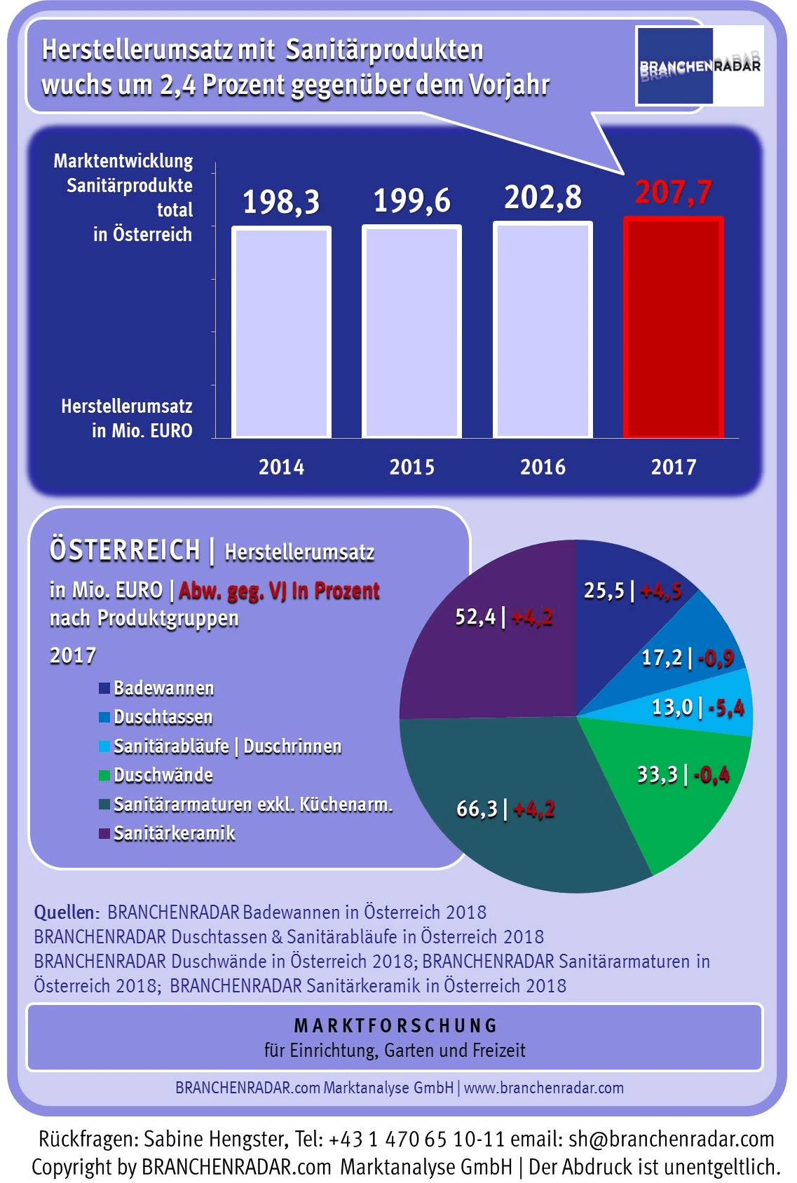 Aktuelle Daten von Marktstudien zu Sanitärprodukten in Österreich von BRANCHENRADAR.com Marktanalyse zeigen auf, wie es in den einzelnen Bereichen 2017 verlief. Alles in allem entwickelte sich im vergangenen Jahr der Markt für Sanitärprodukte (Badezimmer + Toiletten) erfreulich. Die Herstellererlöse wuchsen insgesamt um 2,4 Prozent gegenüber 2016 auf 207,7 Millionen Euro. Der Anstieg war zum überwiegenden Teil nachfragegetrieben, infolge einer robust wachsenden Neubauproduktion. Ein Umsatzplus gab es allerdings nur in drei von sechs erfassten Warengruppen.