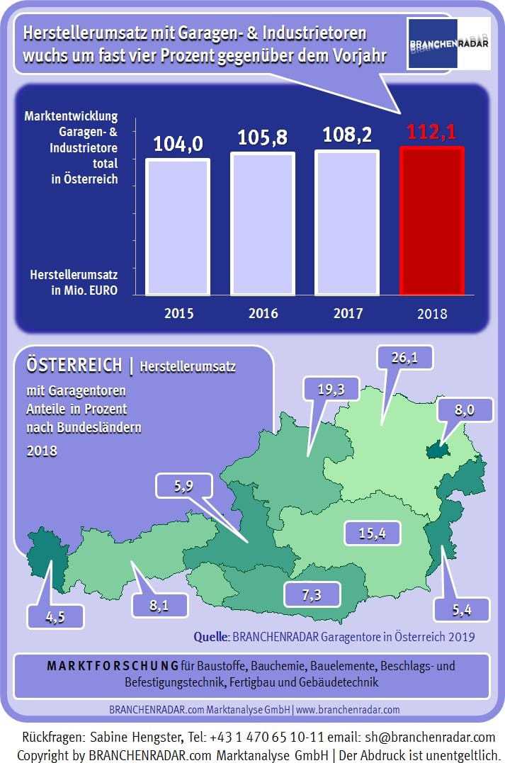 Der Markt für Garagen- und Industrietore wuchs in Österreich im Jahr 2018 robust um fast vier Prozent. Das Wachstum war allerdings nur noch preisgetrieben, wie aktuelle Daten einer Branchenradar-Analyse zeigen. So erhöhten sich die Herstellererlöse um 3,6 Prozent gegenüber dem Vorjahr auf insgesamt 112,1 Millionen Euro. Davon entfielen 58,6 Millionen Euro auf Garagentore (+ 3,8 Prozent gegenüber dem Vorjahr) und 53,5 Millionen Euro auf Industrietore (+3,4 Prozent gegenüber den Vorjahr). Die Nachfrage stagnierte auf Vorjahresniveau. Bei Garagentoren erhöhten sich die Preise um durchschnittlich knapp fünf Prozent, bei Industrietoren um rund drei Prozent gegenüber dem Vorjahr.
