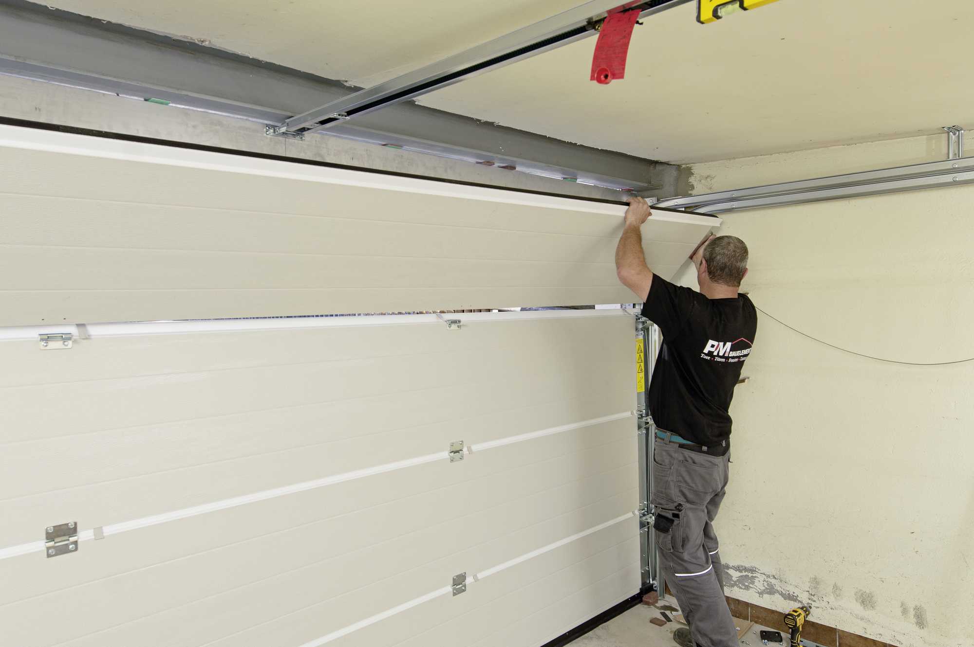 Das Haus wurde abgerissen und neu errichtet. Die alte Garage hat allerdings überlebt. So blieb auch ein Stück des elterlichen Anwesens erhalten. Das alte Konstrukt wurde mit einem Doppel-T-Träger über der großen Einfahrt verstärkt. Darunter kam für das neue Garagentor ein neuer Aluminium-Hilfsrahmen. Er wurde nach oben im Doppel-T-Träger befestigt und zur Seite soweit wie möglich im Mauerwerk verankert. Dieser Hilfsrahmen bildete die Basis für das neue UniPro-Sektionaltor von Wiśniowski. An den exakt ausgerichteten Aluminium-Hilfsrahmen wurden anschließend die seitlichen Führungsschienen des Sektionaltores montiert. In der waagerechten ausgerichtet und hinten mit einem Querriegel miteinander verbunden dienen diese Führungsschienen aus als Halterungen für die hinten angebrachten Federn. Diese heben, nachdem sie entsprechend vorgespannt wurden, mit Hilfe zweier Seile das Sektionaltor fast an, so dass der Kraftaufwand zum Öffnen des Tores nur minimal ist. Der elektrische Garagentorantrieb hat somit kaum hohe Lasten zu tragen und kann elegant auf etwaige unplanmäßige Widerstände reagieren.