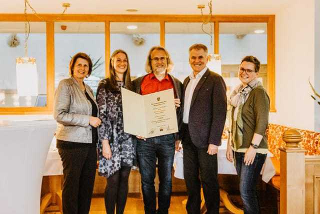 Firmenfeier 30 Jahre Bauatelier Schmelz Salomon: v.l. ÖKR Maria Forstner, Tatjana Salomon, Winfried Schmelz, Landesinnungsmeister Robert Jägersberger und Michaela Smertnik vom NÖ Bau Energie und Umwelt Cluster.