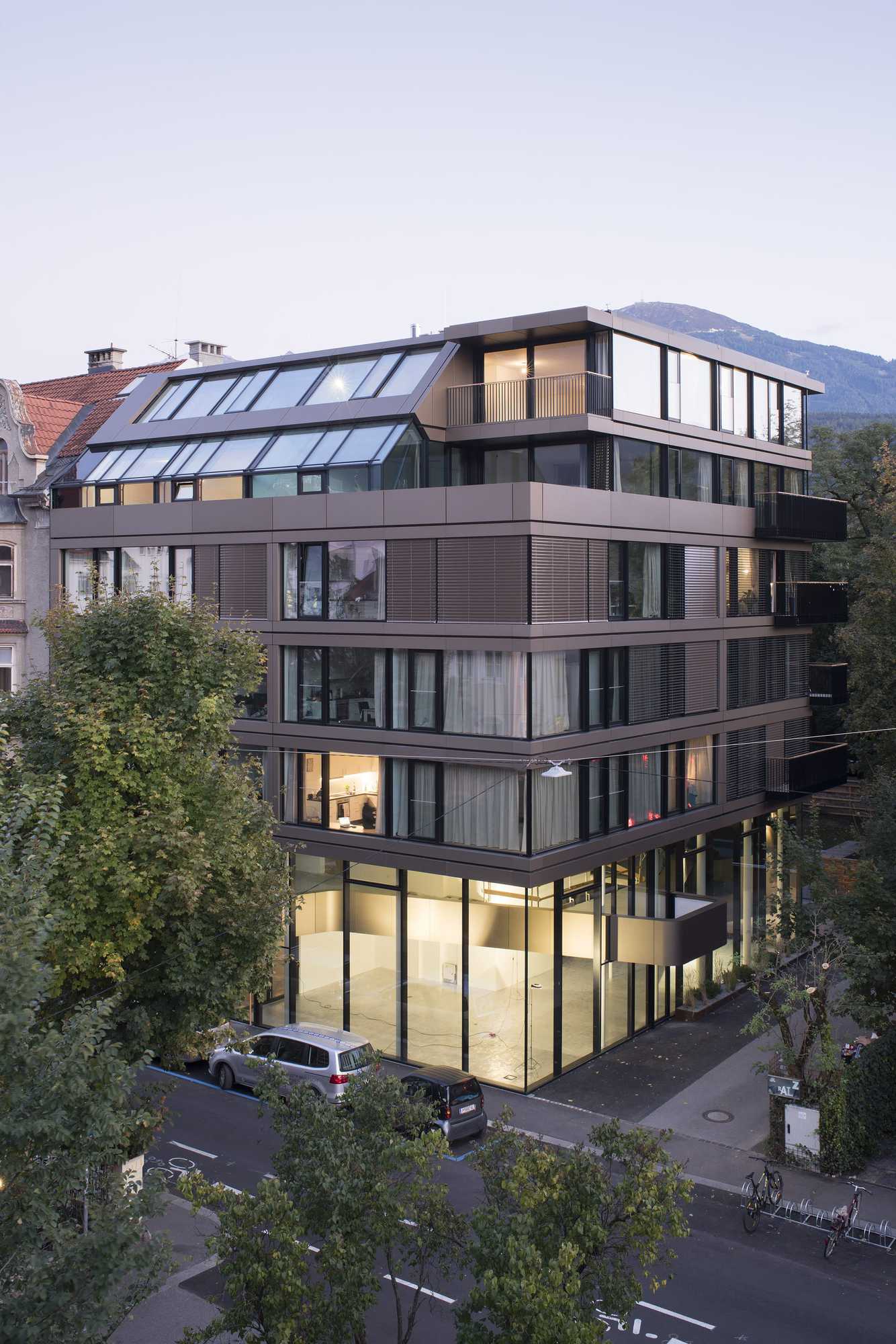 Das Wohn- und Geschäftshaus M 11 in Innsbruck ist ein gelungenes Beispiel für ein zeitgemäßes Stadthaus. Es fügt sich von seiner Grundkonfiguration in die umgebende Blockrandbebauung ein und setzt in seiner Materialität und Gestaltung ein zeitgenössisches Statement. Die hohe transparente Erdgeschoßzone mit Galerie wird für Geschäfte und Büros genutzt. Darüber befinden sich 17 Wohnungen unterschiedlicher Größe und Orientierung. Mit den großzügigen Glasflächen, dem gekonnten Einsatz von Aluminium-Profilen und den spielerisch angeordneten Balkonen ergibt sich ein bewegtes, lebendiges Fassadenbild.
