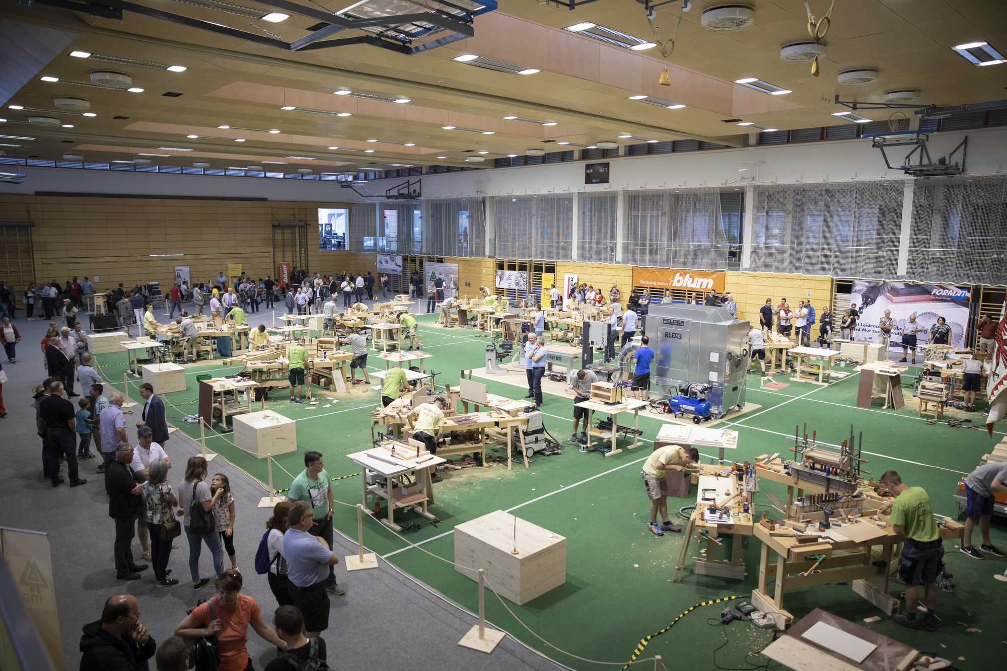 Die Tischlereitechniker waren ebenso in das Projekt eingebunden, sie wurden sowohl einzeln als auch für das Team bewertet: Die Tischlerlehrlinge im vierten Lehrjahr Planung mussten am Computer ein modernes Badezimmer unter Berücksichtigung des Werkstücks planen. Die Lehrlinge des vierten Lehrjahrs Produktion bereiteten währenddessen das Modellmöbel und andere Stücke für die CNC-Maschine auf. Neben der Komplexität der Verbindungen und der Herausforderungen, die das Hartholz Kirsche in der Bearbeitung mit sich bringt, war es vor allem die knappe Zeit und die Beobachtung durch rund 500 Zuschauer in der Halle, mit der die Teilnehmer zurechtkommen mussten. Aber alle wurden rechtzeitig fertig und konnten ihren Tisch der gestrengen Jury zuführen, die sich die Entscheidung nicht leicht machte.