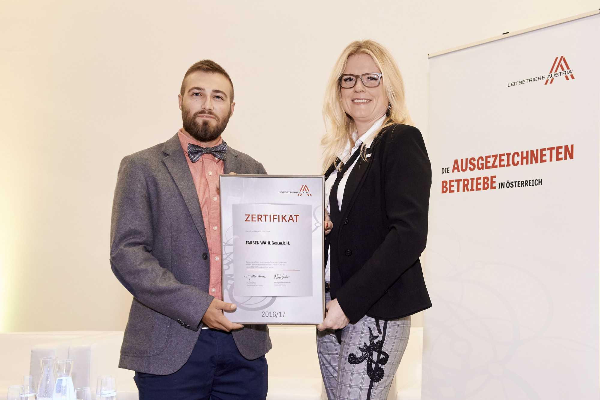 Im Rahmen einer feierlichen Zeremonie nahm Dominik Wahl die Auszeichnung von Leitbetriebe Austria-Geschäftsführerin Monica Rintersbacher entgegen. Als Leitbetriebe werden nach einem umfassenden Screening jene vorbildhaften Unternehmen ausgezeichnet, die sich zu nachhaltigem Unternehmenserfolg, Innovation und gesellschaftlicher Verantwortung bekennen.