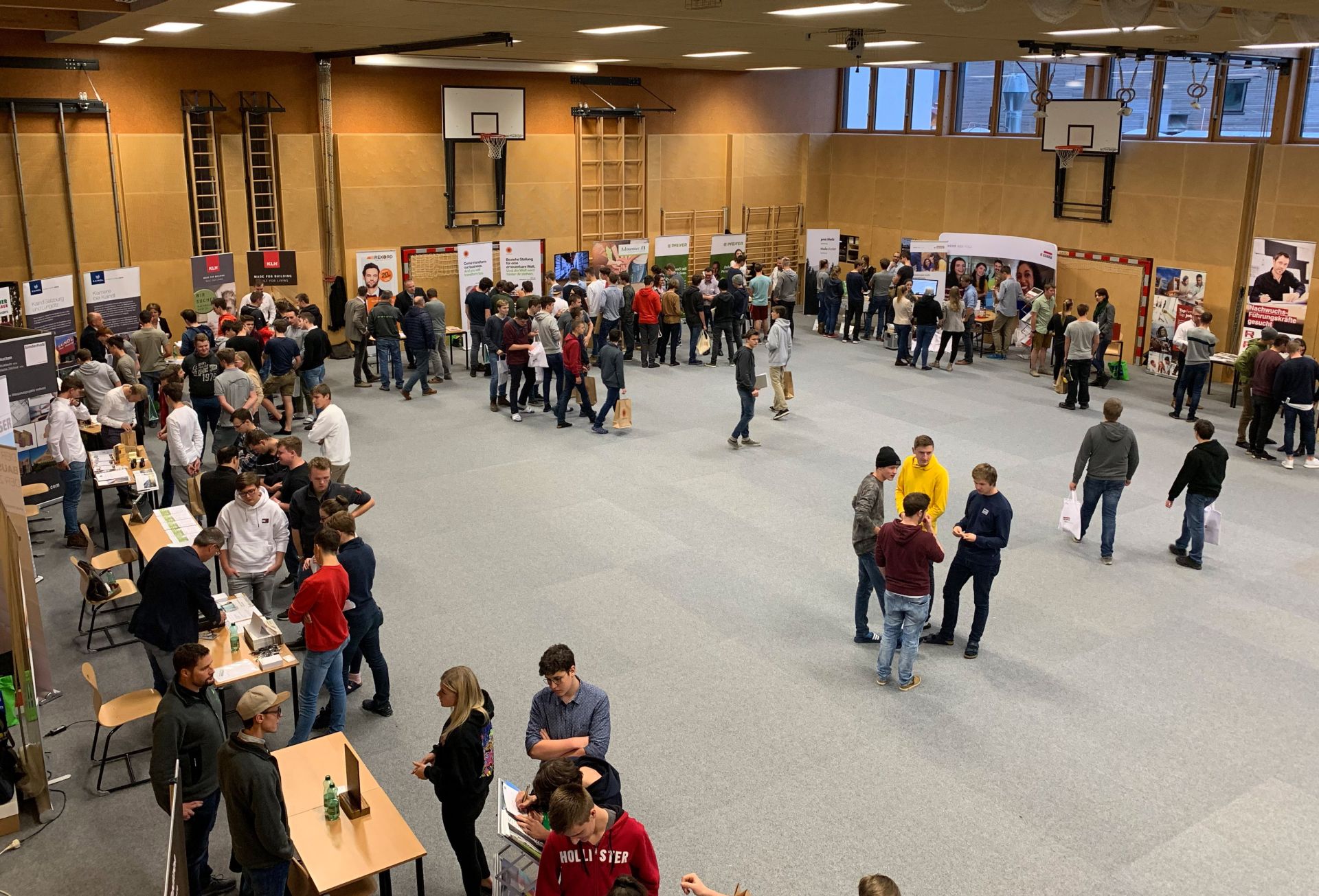 Kontakte zwischen Arbeitgeber*innen und zukünftigen Arbeitnehmer*innen in der Holzbranche herzustellen - das stand am Mittwoch, dem 23. November 2022 von 13.30 bis 17.00 Uhr am Holztechnikum Kuchl (HTK) anlässlich des Unternehmer- und Karrieretages am Programm. Gesprächen zwischen Wirtschaftstreibenden und zukünftigen Fach- und Führungskräften in der Holzwirtschaft fanden in der HTK-Turnhalle statt. Rund 160 Schüler*innen sowie FH-Student*innen und Absolvent*innen haben sich bei den einzelnen Unternehmen über die Karrieremöglichkeiten informiert. Die Teilnahme ist für aktive Mitglieder des Schulvereines Holztechnikum Kuchl eine exklusive Plattform. Sie konnten potentielle Mitarbeiter*innen von morgen über Karrierechancen informieren, aber auch mögliche Diplom- und Fachschulabschlussarbeiten und Betriebspraktika besprechen. (gh)