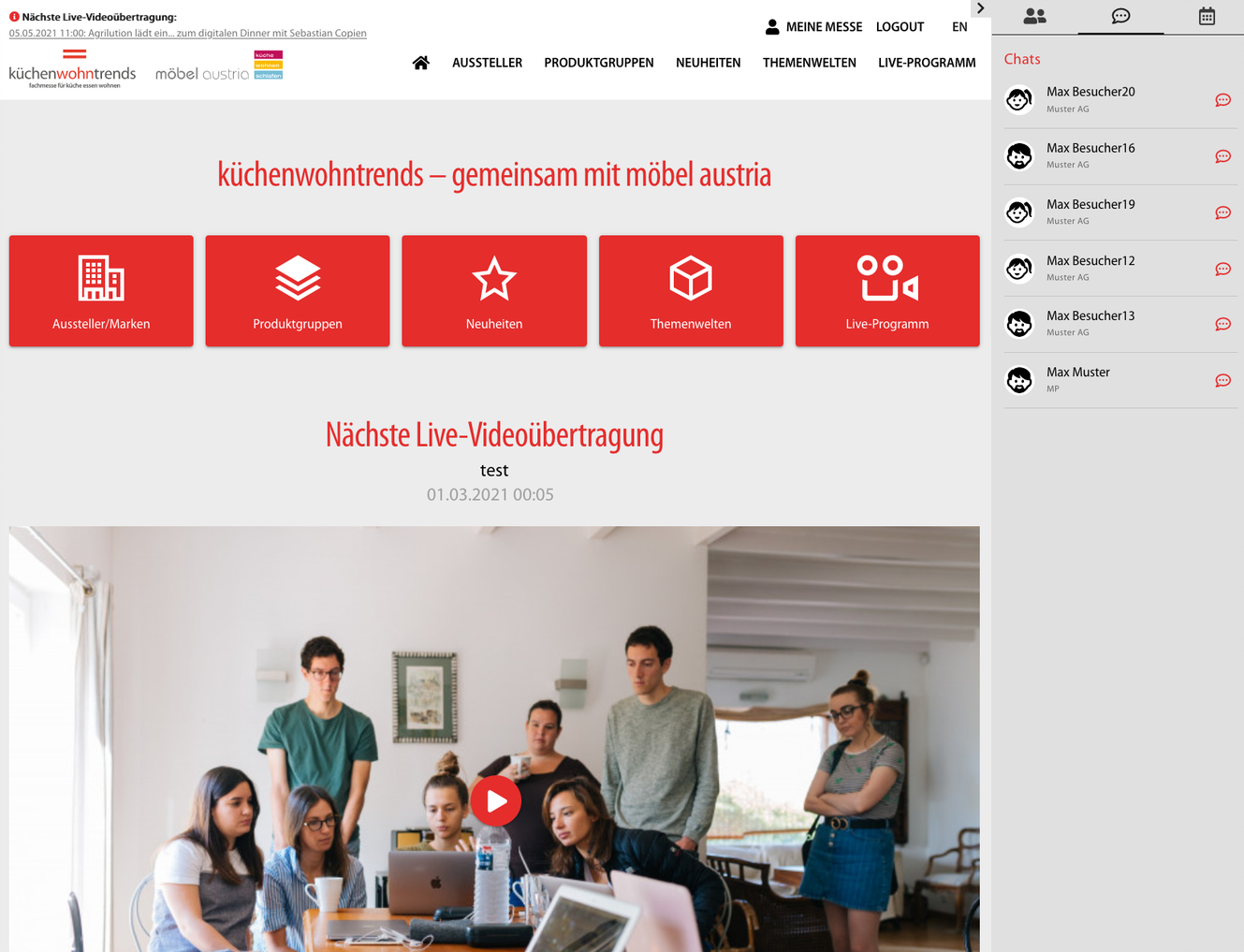 Vom 3. bis 7. Mai fand die erste virtuelle Ausgabe des Fachmessedoppels Küchenwohntrends und Möbel Austria statt. Nach abschließender Auswertung wurden 7.405 Visits von 1.662 eindeutig personalisierten Besuchern auf der Plattform gezählt. Die Zahl der Mehrfachbesucher beurteilt die Messe für eine Online-Messe überdurchschnittlich gut. Für die Veranstalter lassen sich auch online gute Geschäftserfolge generieren, wertvolle Kundenkontakte anbahnen und Neuentwicklungen kommunizieren. Auf der anderen Seite aber auch, dass physische Veranstaltungen unverzichtbar bleiben.
