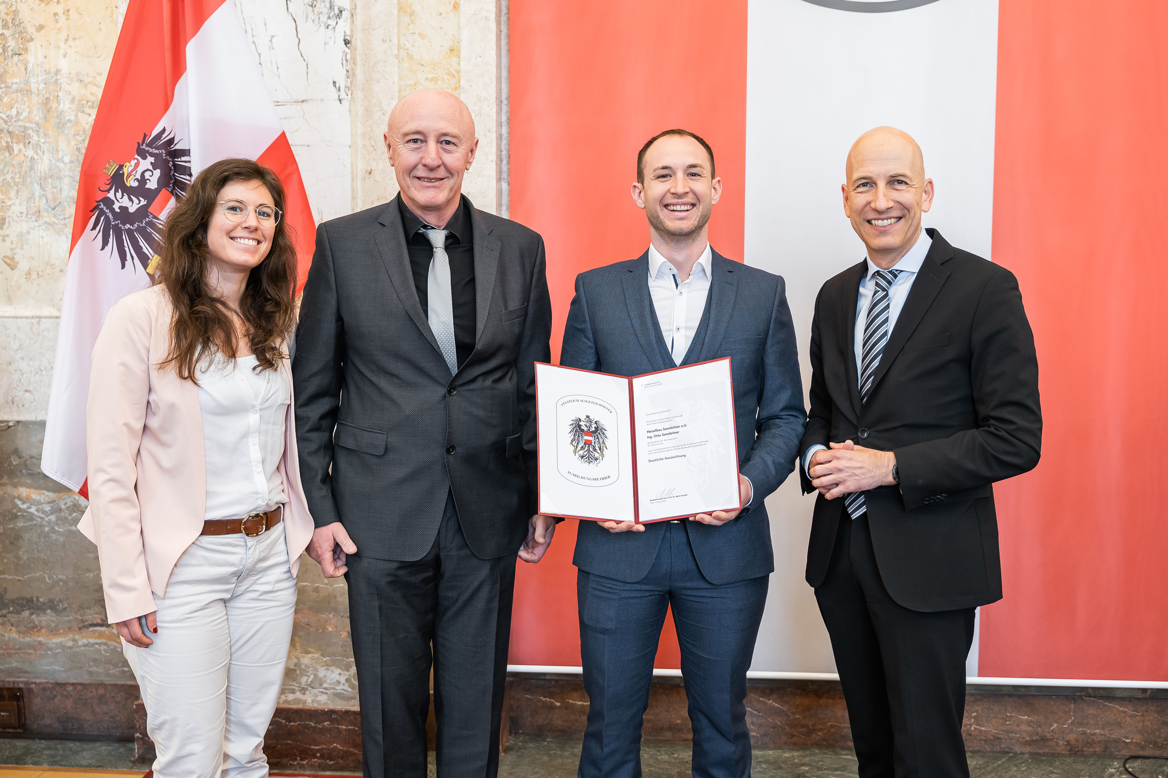 Der Bundesminister für Arbeit und Wirtschaft Martin Kocher überreicht der Firma Metallbau Sonnleitner die Urkunde „Staatlich ausgezeichneter Ausbildungsbetrieb“. Sabrina, Thomas und Otto Sonnleitner nahmen diese in feierlichem Rahmen am 28. April 2023 im Marmorsaal des Regierungsgebäudes entgegen. Die Auszeichnung gebührt Betrieben aufgrund außergewöhnlicher Leistungen bei der Ausbildung von Lehrlingen. Aktuell sind bei Metallbau Sonnleitner sechs Lehrlinge beschäftigt. Insgesamt hat das seit 1990 existierende Unternehmen bereits 41 Lehrlinge ausgebildet. Und das mit Erfolg, wie sich durch regelmäßige Auszeichnungen bei Lehrabschlussprüfungen sowie top Platzierungen bei berufsspezifischen Wettbewerben zeigt. 2019 wurde der Betrieb bei den Bundeslehrlingswettbewerben in Hallein zu „Österreichs besten Lehrbetrieb“ gekürt, Platz 1 ging damals an Sebastian Widmann (ehem. Lehrling, mittlerweile Facharbeiter bei Metallbau Sonnleitner).