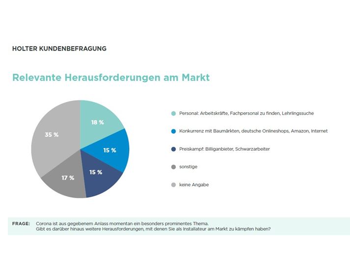 Der Fachkräftemangel, die starke Vertriebskonkurrenz von Baumärkten und dem Online-Handel sowie der Preiskampf sind die größten Herausforderungen der Installateure am Markt. Das ist das Ergebnis einer vom renommierten Marktforschungsinstitut Market im Auftrag des Sanitär- und Heizungsgroßhändlers Holter durchgeführten telefonischen Kundenbefragung. Insgesamt kamen im Zeitraum von 29. September bis 12. November über 300 Installateurpartner aus ganz Österreich zu Wort.