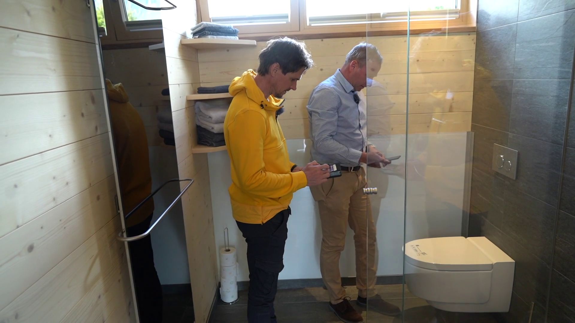 Gemeinsam mit dem Chef der Firma Energietechnik Pichler, Thomas Pichler, erfolgt anschließdne die Inbetriebnahme des Geräts. Pichler erklärt die umfangreichen Komfortfunktionen sowie die Bedienung per Smartphone App, die Gottwald sogleich auf sein Smartphone lädt. Mit der Home App von Geberit lassen sich die meisten Dusch-WC Modelle und auch andere Produkte von Geberit einfach und intuitiv steuern.