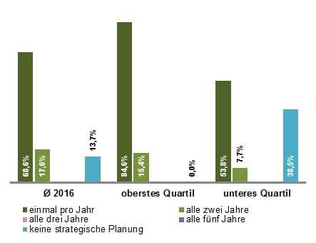Im direkten Vergleich der Erfolgsfaktoren nimmt die Unternehmensstrategie bei allen befragten Bauunternehmen einen der hintersten Plätze ein was die Wichtigkeit betrifft. Dennoch fördert die Frage, wie häufig die strategische Unternehmensplanung durchgeführt bzw. erneuert wird deutliche Unterschiede zwischen den befragten Bauunternehmen zutage. Die Abbildung zeigt auf, dass im obersten Quartil zumindest alle zwei Jahre eine strategische Planung durchgeführt wird, während die weniger erfolgreichen Bauunternehmen zu fast 40 Prozent überhaupt keine strategische Planung bewusst festschreiben. So gesehen kann die Einschätzung, dass die strategische Planung nur geringe Wichtigkeit für den Unternehmenserfolg hat, zumindest relativiert werden.