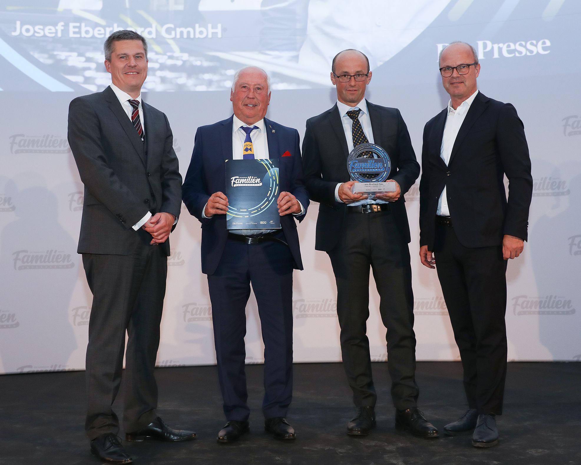 Markus Mair, Vorstandsvorsitzender Styria Medien Gruppe, übergibt die Auszeichnung an Christoph Riegler, Geschäftsführer Fisch-Tools, Josef Eberhard, Seniorchef Fisch-Tools, und Andreas Eberhard, Geschäftsführer Fisch-Tools. (v.l.)