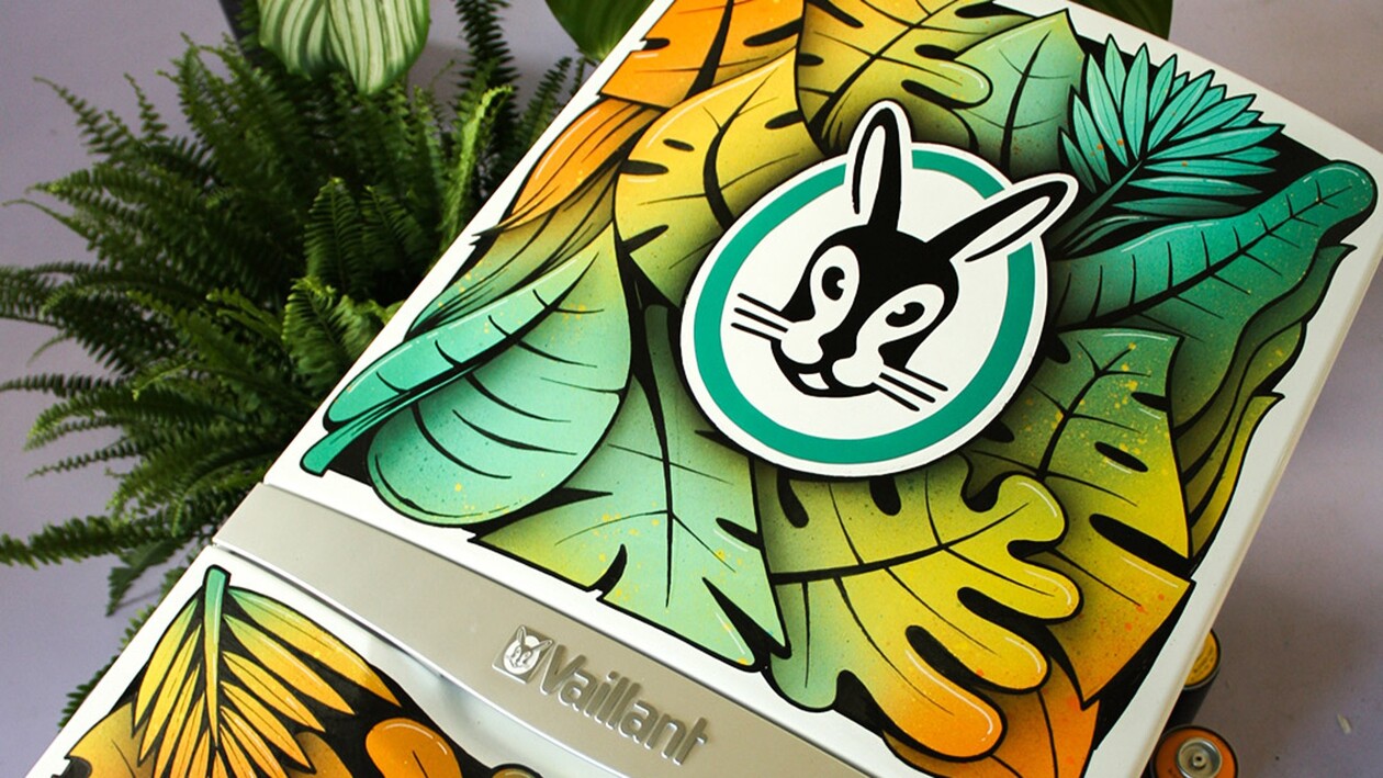 Mit einer von Künstler Luca Laurence in Szene gesetzten Wärmepumpenverkleidung lässt Vaillant derzeit einen absoluten Blickfang versteigern.