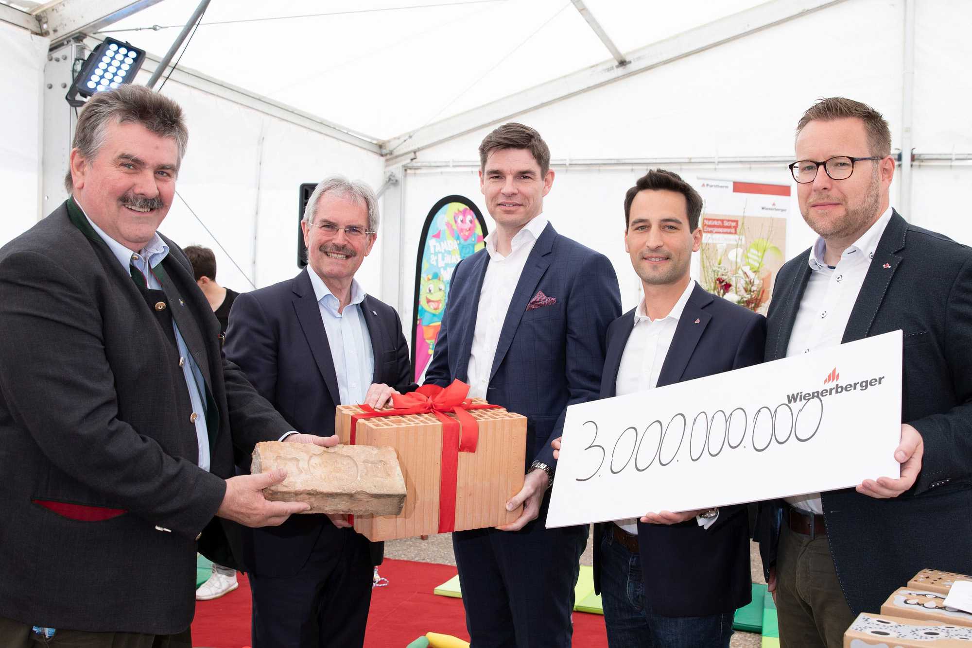 Mike Bucher, Geschäftsführer Wienerberger Österreich, hieß am 27. April zusammen mit Werksleiter Michael Toth die zahlreichen Besucher herzlich willkommen. „Als österreichisches Produktionsunternehmen schätzen wir ein gutes Verhältnis zum lokalen Umfeld und freuen uns über das große Interesse, um gemeinsam auf den 200. Geburtstag von Wienerberger anzustoßen“, so Bucher, der im Rahmen der Eröffnung symbolisch den dreimilliardsten Ziegel, der seit 1987 im Ziegelofen des Hennersdorfer Werks hergestellt wurde, an Karl Wilfing übergab.